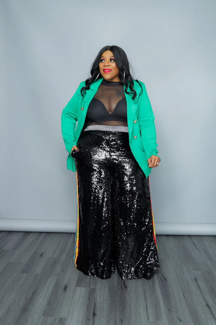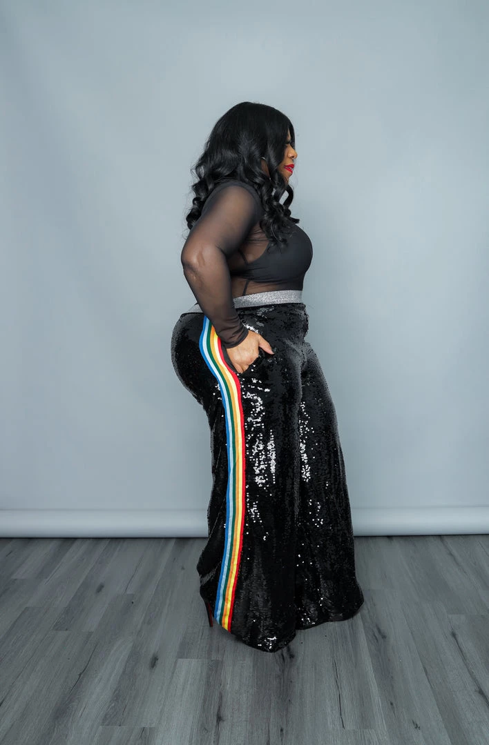 Sequin designed, full length, high waisted pants in a loose fit with a waistband, side pockets, multi-colored stripe detail, and wide legs.