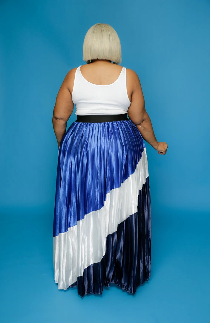 Solid, color block, high waisted maxi skirt in a loose fit with a faux leather waistband, pleats, and shiny coated finish.