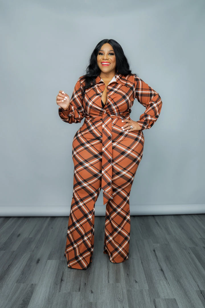 Curvaceous Boutique Brown Perfect In Plaid Jumpsuit JUMPSUITS