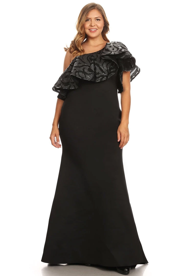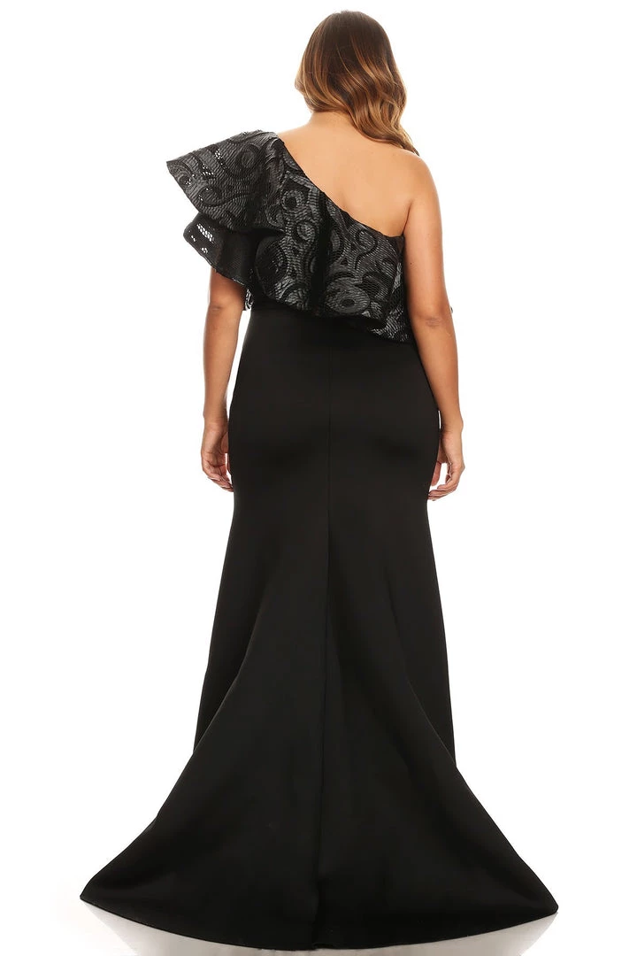 This solid,one shoulder maxi dress in a mermaid silhouette with a layered short sleeves, ruffle, and faux leather trim.