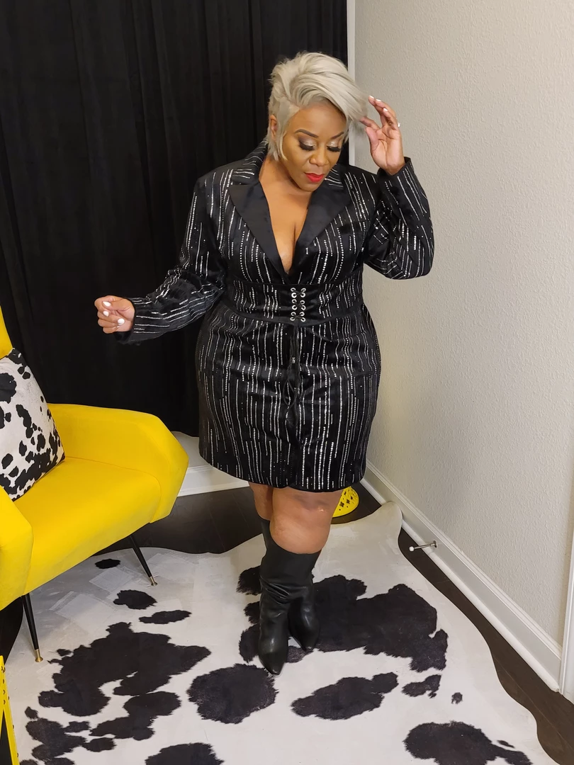 Suede, sequined party dress features a detachable corset belt with an embellished chain zipper in the back, creating a flattering waist-minimizing effect. Long sleeves are finished with buttoned cuffs. Front features two visible buttons as well as hidden